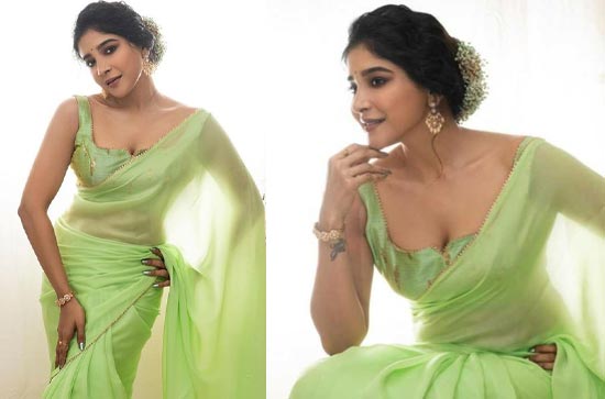 Sakshi Agarwal is not only an actress but also a model and a television presenter. Her beauty and talent have won the hearts of many in South India. In this picture, she sizzles amazingly in a green saree, which makes people feel envious of her. Her facial features are strikingly beautiful. She has large expressive eyes, full lips, and a sharp jawline that accentuates her beauty.