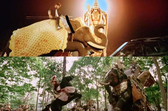 Sources say that this shot has been inspired by a Hollywood film called 'Alexander'. The character Porus stumps Alexander by riding an elephant in that scene which is considered a highlight for that hit movie. This scene therefore was replicated in a different way in Chiru's film and sources say this scene was the inspiration.