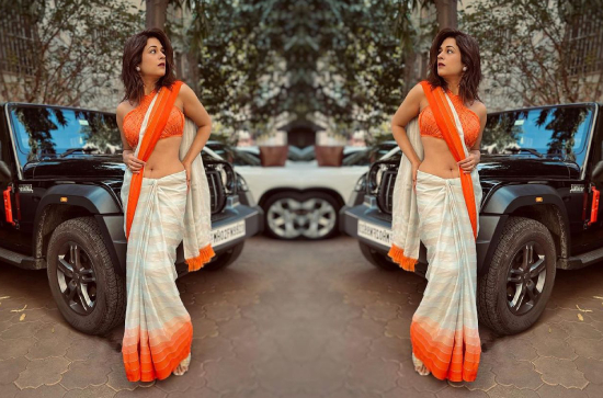 This is Shraddha in a fashionable saree with attractive saffron shades. Her hot navel show which she is revealing in a rather teasing manner is clearly the toast of the season which also inspires other young women to stay fit.