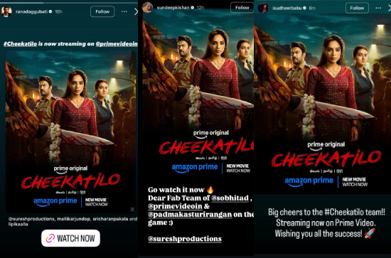 Sudheer Babu cheered, "Big cheers to the #Cheekatilo team!! Streaming now on Prime Video. Wishing you all the success!"
