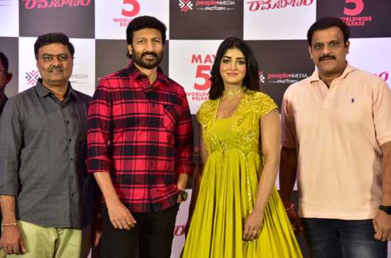Ramabanam, produced by People Media Factory, directed by Sriwass, is all set to hit the screens on May 5. The film features Gopichand, Jagapathi Babu, Dimple Hayathi, Khushbu, Khushbu, Sachin Khedekar, Nasser, Ali, Raja Ravindra, Vennela Kishore, Saptagiri, Kashi Vishwanath, Satya, Getup Srinu, Sameer, and Tarun Arora. With a promise to offer a wholesome cinematic experience, the film has all the essential commercial ingredients, with music by Mickey J Meyer.