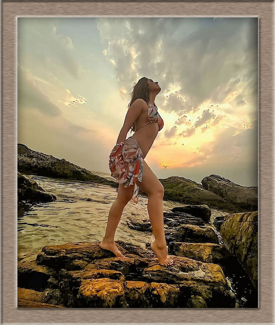 Meanwhile, Sidhika decided to keep her fans busy by offering them a visual feast. Here she is, standing on the rocks clad in a bikini and draped by a sarong. While she is enjoying the beauty and magic of Nature, her followers are lost enjoying her delicious offering.