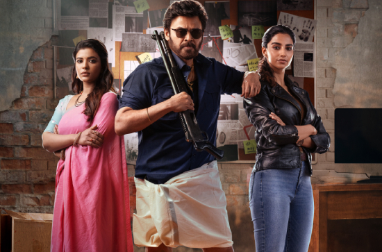 The first look poster features Venkatesh in a lungi, sporting shades and holding a gun with a serious expression. His on-screen wife, Aishwarya Rajesh, appears in a traditional look, while his ex-lover, played by Meenakshi Chaudhary, is seen in a modern avatar. Venkatesh's look blends traditional and stylish elements, and his charisma shines through in the poster.