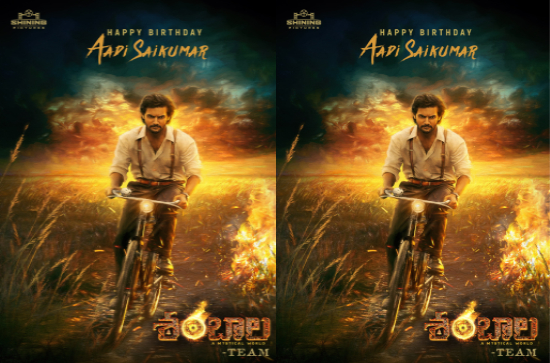To celebrate promising hero Aadi Saikumar's birthday, the makers of his upcoming supernatural horror thriller, "Shambhala," have unveiled an intriguing new poster. The image depicts Aadi intensely focused as he cycles through a fiery landscape, igniting curiosity about his character and the film's mystical premise.